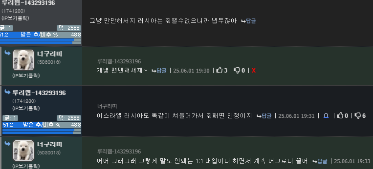 내가 하지도 않은말 날조 본문과 전혀무관한 러시아 댓글들고와서 시비거는 분탕에게 무슨 예의를 갖춰야합니까 | 26.02.09 00:57 | | |