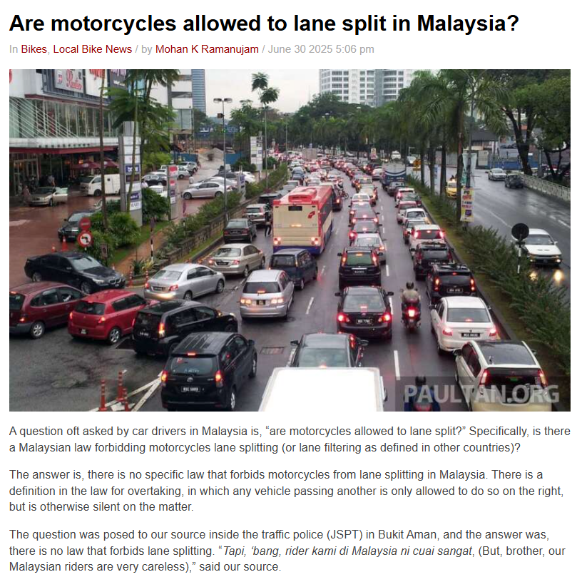 https://paultan.org/2025/06/30/are-motorcycles-allowed-to-lane-split-in-malaysia/ 말레이시아는 차간주행이 정해진 법이 없다네