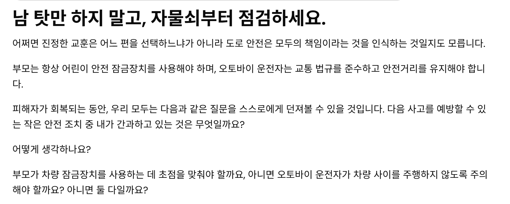일단은 부모 책임 맞다고 봐. 토론 오고간 차간 주행이니 뭐니를 떠나서, 만약 저 문을 연 게 어른이면 문 연 게 잘못이지! 할 거잖아? 근데, 그 당사자가 애기다? -> 그럼 그 애기에 대한 책임은 누가 있는가? -> 당연히 부모라는 수순으로 갈 테니. | 26.02.10 01:27 | | |