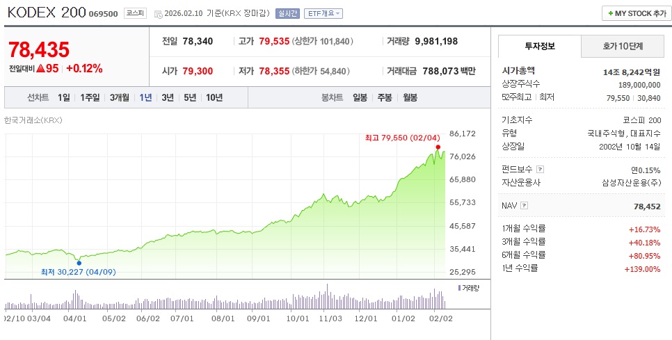 국장에서 가장 큰 ETF인 KODEX 200의 1년 수익률은 139%다. 1년 전에 1억을 넣었으면 배당을 제외하고도 2억3900만원이 되어 있다는 말이다