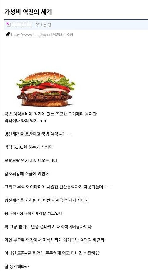 그돈이면 뜨끈한 국밥 => 국밥 비싸니까 버거 => 이제 버거도 비싸니까 국밥 이런걸로 경쟁하지 마 ㅅㅂ