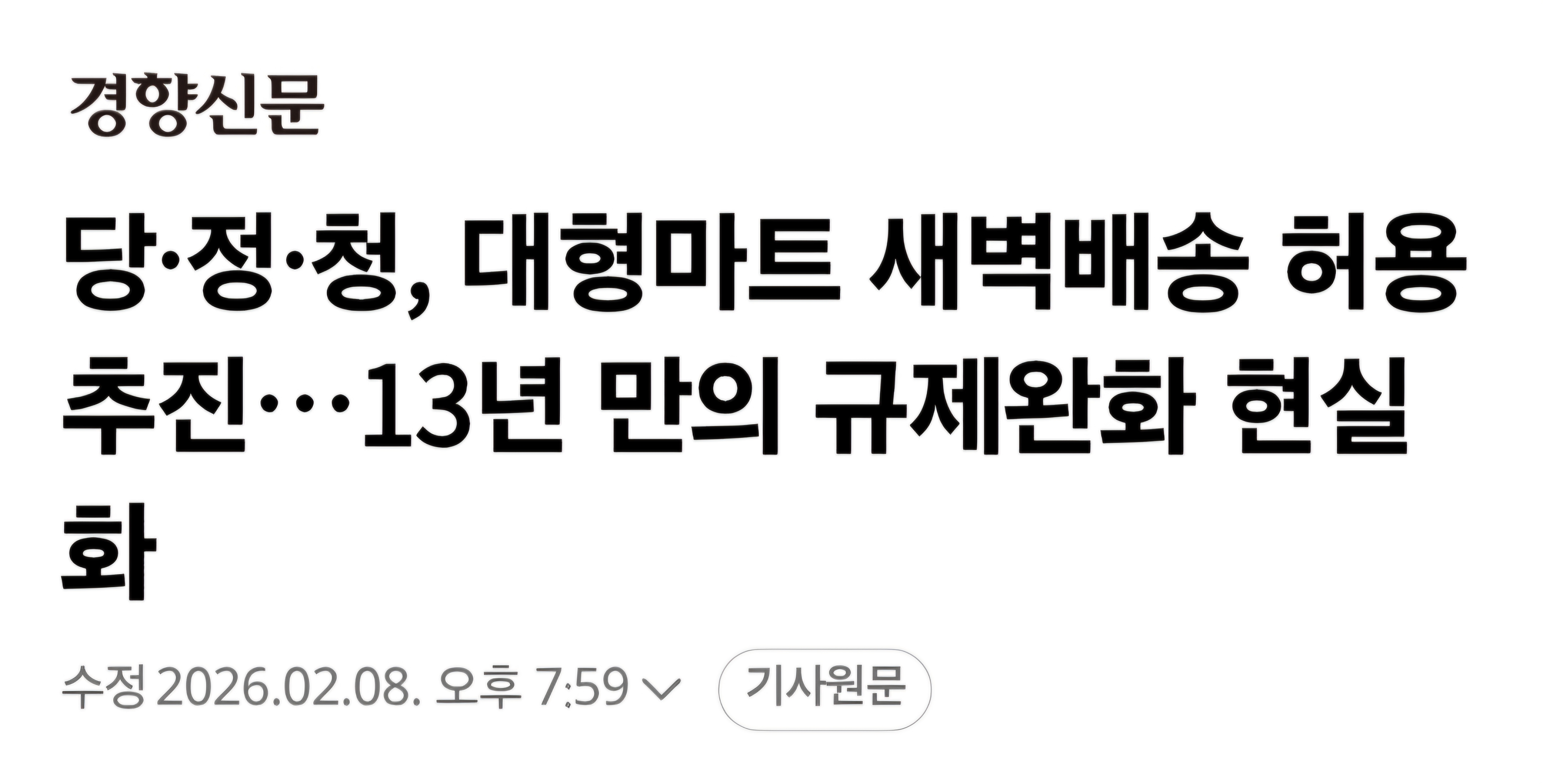 특혜를 주는게 아니라 불이익 주던걸 폐지하는 거임. 대형마트 새벽배송 금지해서 시장과 골목상권 보호하겠다고 했는데, 결과는 쿠팡 같은 온라인 배송업체만 이익을 봤기 때문에. | 26.02.12 11:30 | | |