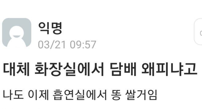 담배 피는 애들끼리만 연기 마시라고 가둬두는거 아님? 밖으로 내뿜을거면 가둔 의미가 없잔아 | 26.02.13 17:44 | | |