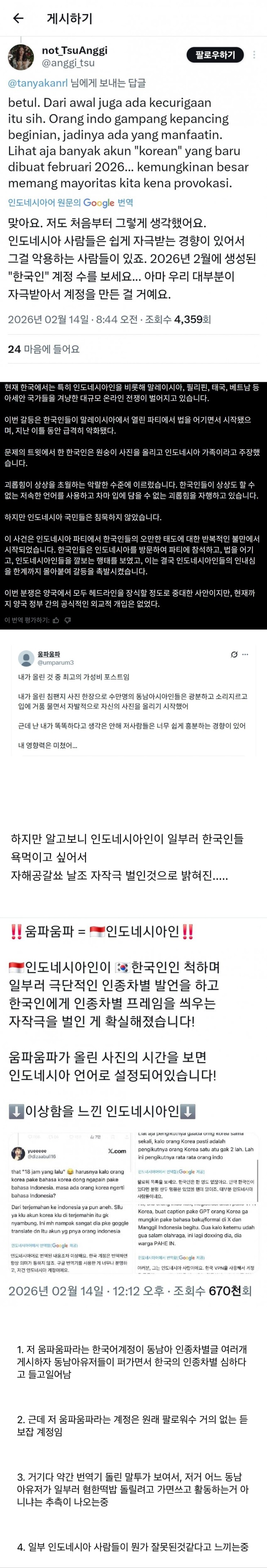 짤 자체도 되게 자극적이고 내용도 호응하기 좋긴 하잖어 이래저래 참고로 저기서 얘기하는 '한국인이 동남아 인을 원숭이라고 모욕했다!' 는게 https://x.com/umparum3 이 계정. 들어가보면 일베 이상으로 역함. 막상 저 댓에서 '한국을 막기위해 동남아가 연합한다!' 는 것도 저거에 반응하는 거 인도네시아 인 말고는 딱히 안 보이는데 저 짤 만들어서 돌리는 게 걍 자기만족인지 진짜인지도 모르겠고 애초에 그 인도네시아도 인구가 2억 5천임. 그럼 저렇게 똑같이 분탕짓하는것도 한국 5배정도 되는거란거고... 쟤들이 저러는 순간 본인도 걍 인종차별자가 되는건데 '쟤들이 인종차별하니 나도 인종차별 하겠어!' 할 필요도 없고... 애초에 이렇게 게시글로 만나고 말 애들인데 저 정도야 걍 깡계취급하고 넘기는 게 맘 편하지. | 26.02.16 15:51 | | |