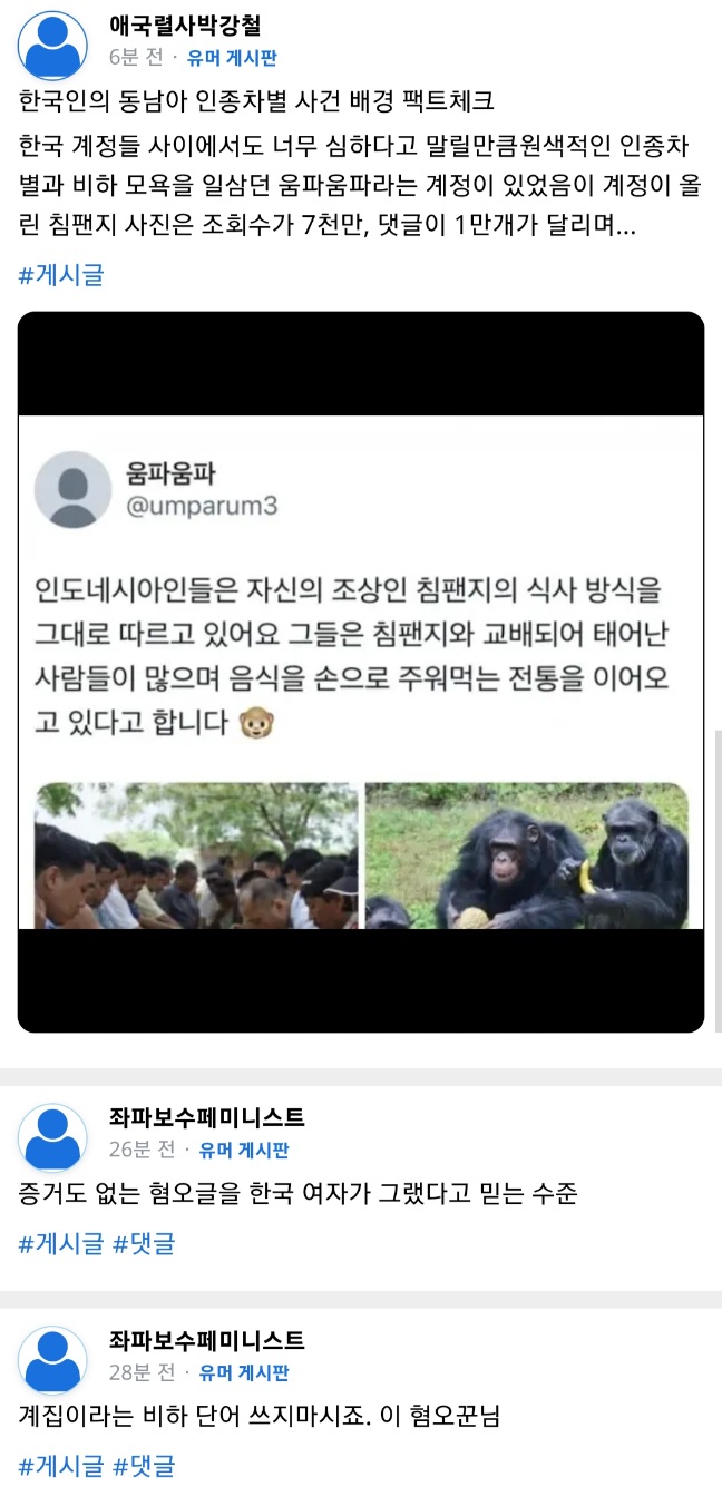 움파움파가 가짜면 얜 뭐냐! 하면서 쓰레드나 인스타에서 인종차별하는 다른 한국계정 들고오는 다른 인종차별자도 있고... 인종차별자들끼리의 싸움에 괜히 휩쓸릴 필요가 없지 | 26.02.16 15:44 | | |