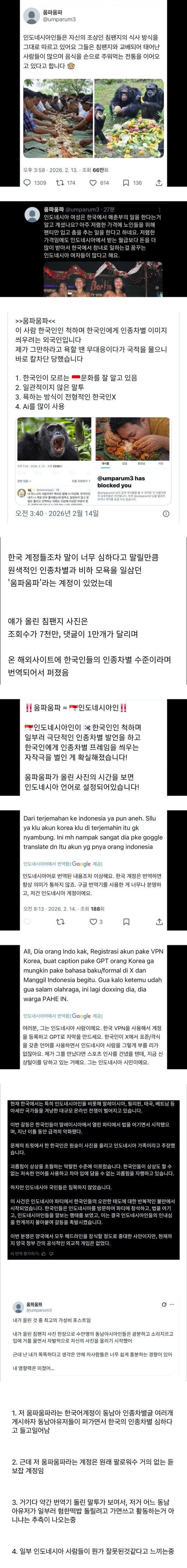 맨처음 오랑우탄 올린계정 인도네시아 계정으로 밝혀졌는데도 저럼 | 26.02.17 12:10 | | |