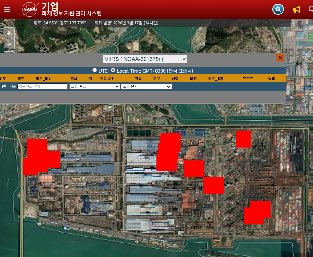위성으로 판단한 화재 스팟. 제철소나 화력발전소같은데도 잡힘 | 26.02.17 17:18 | | |