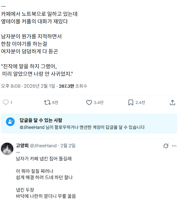 맨바닥도 아니고 냅킨깐거 보니까 정신 못차렸네 | 26.02.17 18:27 | | |