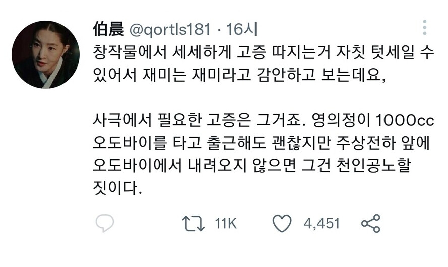 맞긴 함 재미보다 다른데 너무 의미부여를 하는 애들이 많아 창작물은 재미를 얻으려는게 우선인데 물론 그럼에도 그 재미를 너무 크게 해치는 수준의 핍진성 부족은 문제가 되긴 함 예를 들면 뮬란에서 황제한테 두눈 부릅뜨고 대드는 신하들 같은거... 무슨 삼국지 시절 한나라 황제도 아닌데 3족이 멸문 당하고 싶나 뭔 | 26.02.18 01:09 | | |
