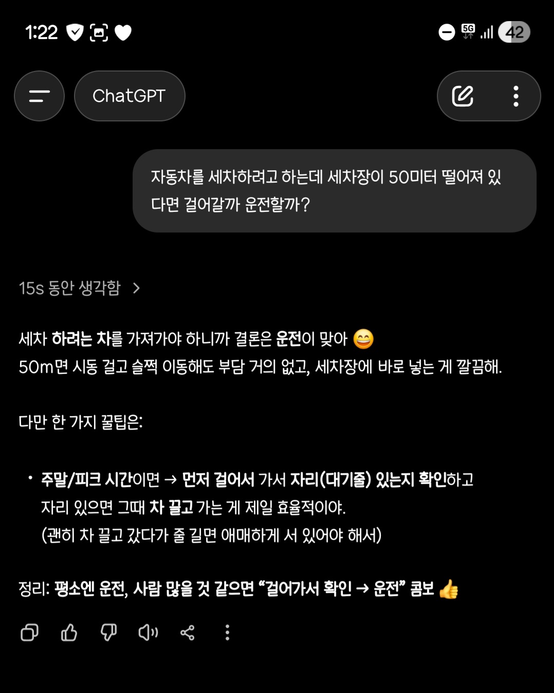 맞음 사람들이 여러번 물어봐도 항상 본인 차 세차하려면 당연히 가져가야 한다, 그럴 목적이 아니면 걸어가는게 좋다 이런 느낌으로 대답함 | 26.02.18 01:00 | | |