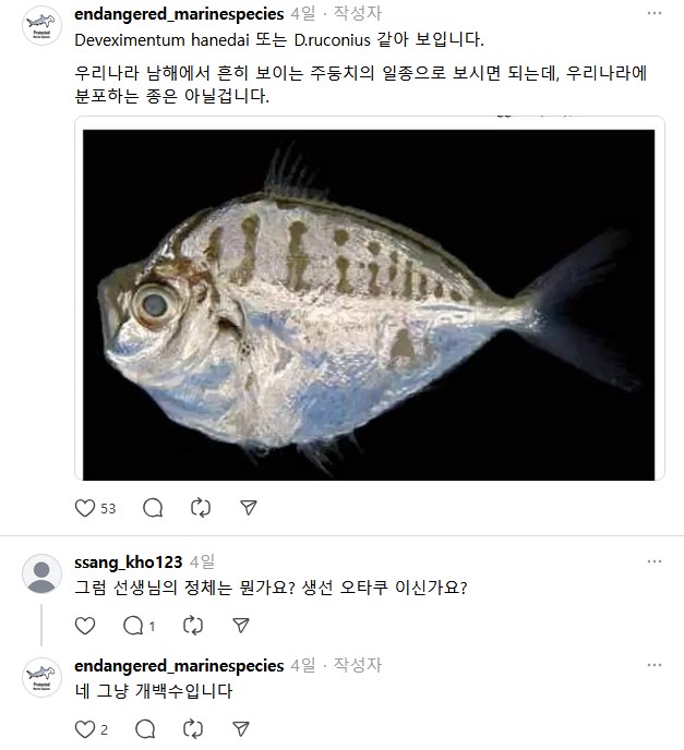 종간변이 뿐만 아니라 종내변이도 있으니까 특히 서,남해 리아스식 해안같은 곳은 예측할수없으니 타국 종과 일치율이 꽤 다르면 그거만으로 좋은 사례가 되고 우리나라만의 아종이라고 할 수 있으니, 우리나라만의 어획자원이라 말할 수 있는 근거가 됨. 그러기 위해선 98퍼 이하의 차이를 보여야겟지만.. | 26.02.18 16:41 | | |