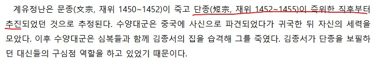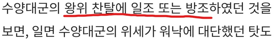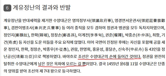 그래서 우리 역사넷과 학계 공식 입장도 일견 수양대군의 위세가 대단한 것도 있지만. 하고 단서를 붙인 거임. 그냥 권력 장악해서 반발 못 했으면 권력의 정점인 왕이 됐으면 더 반발 못 해야지.