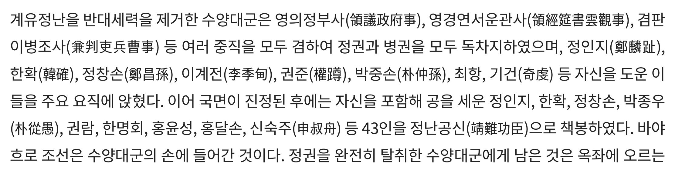 애초에 계유정난 부터가 조카 죽이고 왕할려고 지를거라 뒷수습을 자기 욕심 채우는 방향으로 한게 문제가 아닌것 아닌지....