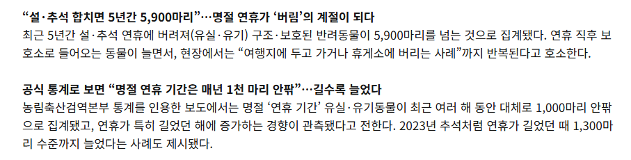 최근 5년간 명절에 유기된 동물 숫자란다. | 26.02.19 09:01 | | |