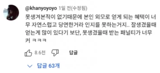 정확한 해석임... 못생겨본적이 없으니까 잘생겨서 받는 혜택이 당연한거고 남들도 다 누리는건줄 안다고