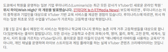 https://automaton-media.com/en/news/japan-is-getting-its-first-cram-school-for-high-schoolers-where-all-of-the-teachers-are-actual-vtubers/ 좋은일 하시는데 응원합니다 ^^