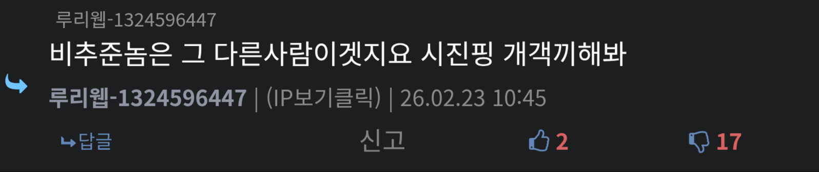 그건 맞지 ㅋㅋㅋ 논리 이상한 경찰(?) 커뮤에서 한두번 보냐고 ㅋㅋㅋㅋ | 26.02.23 10:48 | | |