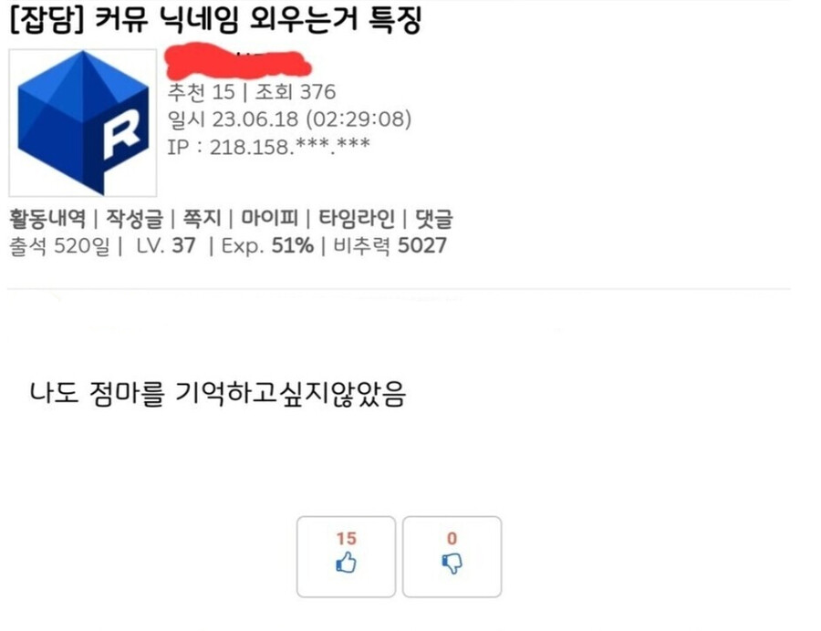 본문도 닉 오픈했으니 안 지우고 그냥 올림 https://m.ruliweb.com/community/board/300143/read/74205648 전문&전후사정이 궁금한 사람은 본문에 나온 제목으로 검색하거나 위 링크로 | 26.02.23 13:12 | | |