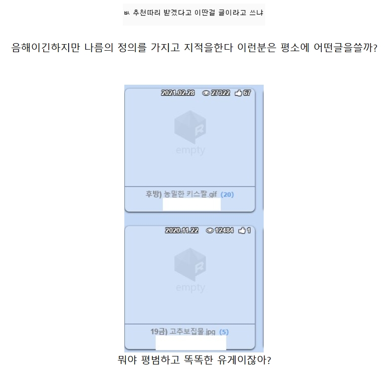 몇번 본 사람들은 알지 쟤 헛소리 하고 지적 받으면 갑자기 지가 헛소리 하던거 생각 안하고 지적한 사람들 병1신 만드는 글 자주 썼음
