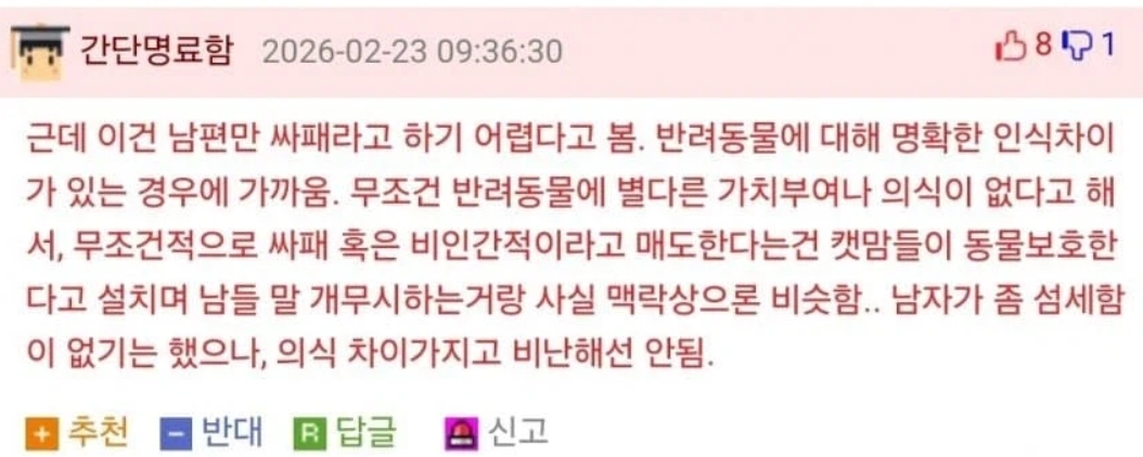 한번 읽고 잘 생각해봐. 세상 모든 사람이 펫을 키우는것도 아니고 펫에게 애정을 느끼는것도 아닌데, 그렇다해서 펫 안키우고 펫 안 좋아하는 사람이 싸패인건 아님. 그런식으로 따질거면 펫에 대해 인식차도 큰데다가 아내가 직장까지 관두고 틀어박혀서 심리적으로 몰린 남편의 심리를 이해나 공감 못하는 너도 싸패가 되는거임 | 26.02.23 23:56 | | |