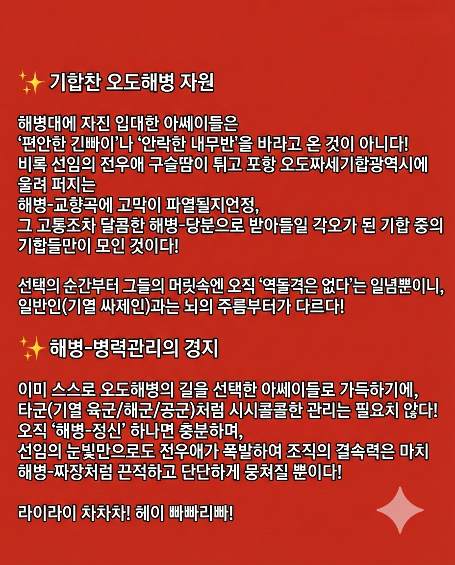 요즘 부사관 대우가 안좋아서 기술직, 인기보직 제외한 전방에서 근무하거나 배타는 부사관은 전역이 힘들 정도로 붇잡는다던…. | 26.02.24 17:21 | | |
