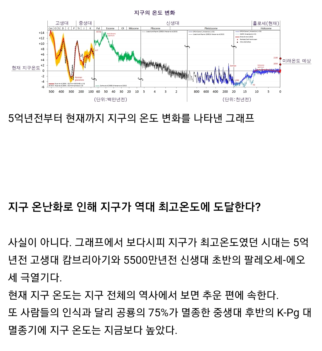 https://youtu.be/Ok__CvkQIUc https://namu.wiki/w/%ED%8C%94%EB%A0%88%EC%98%A4%EC%84%B8-%EC%97%90%EC%98%A4%EC%84%B8%20%EA%B7%B9%EC%97%B4%EA%B8%B0 위 그림에도 나와있는 5600만년 전 신생대 초기의 '팔레오세-에오세 극열기'의 17만년 간은 지구 온도가 무려 지금의 14도나 더 높았지. 이 때가 지상에서 수많은 식물, 곤충, 거대 포유류들이 번성한 시기. 덕분에 우리 영장류가 발달하기 시작하는 계기가 되기도 했고. 다만 해양 생태계는 산호초가 큰 타격을 입는 등 거의 초토화된 시기이기도 했음. 이를 감안하면 온난화로 지구 생태계가 완전히 종말을 맞이한다거나 하지는 않겠지만, 인류의 삶의 질은 이래저래 악화될 듯. | 26.02.28 09:49 | | |
