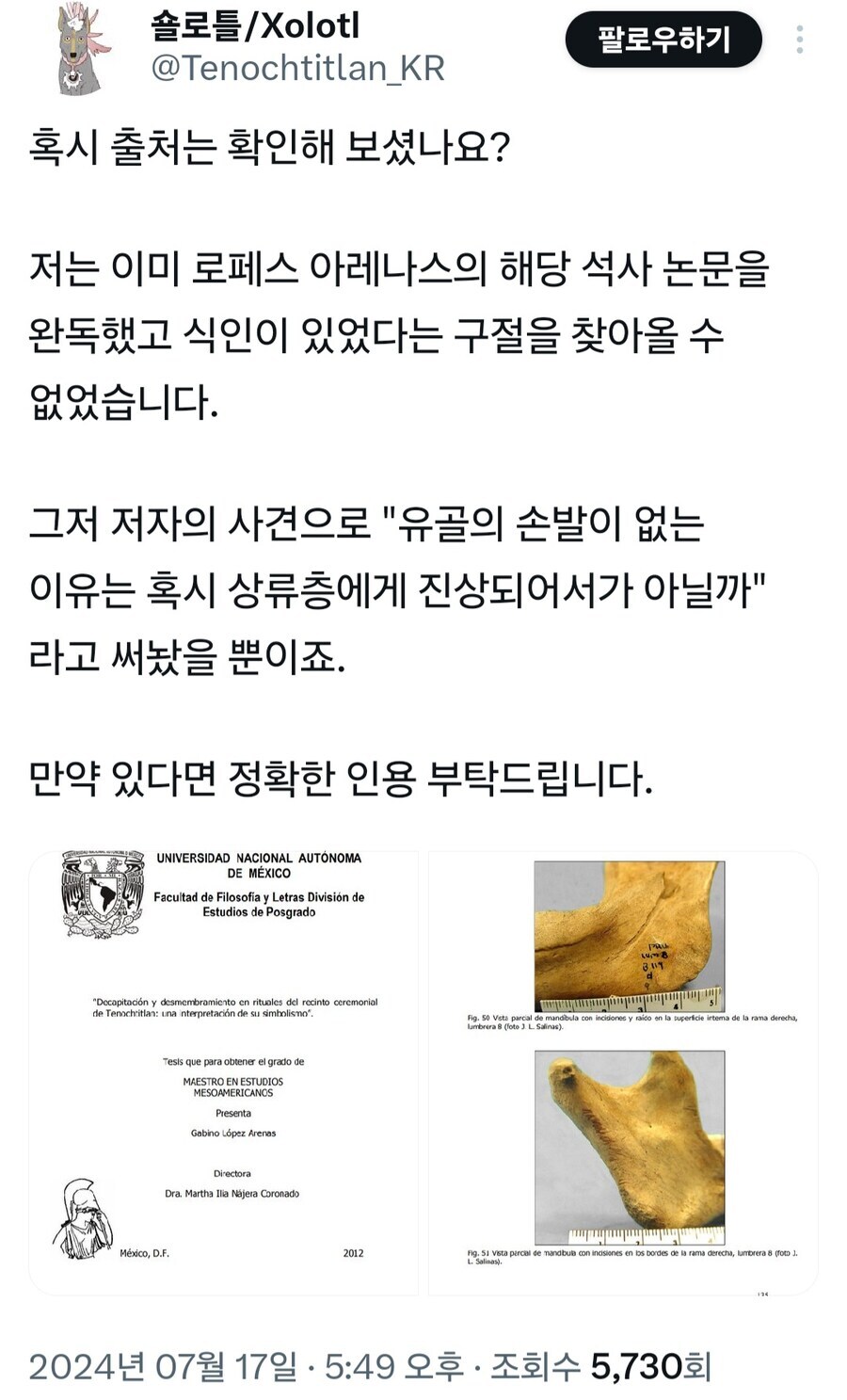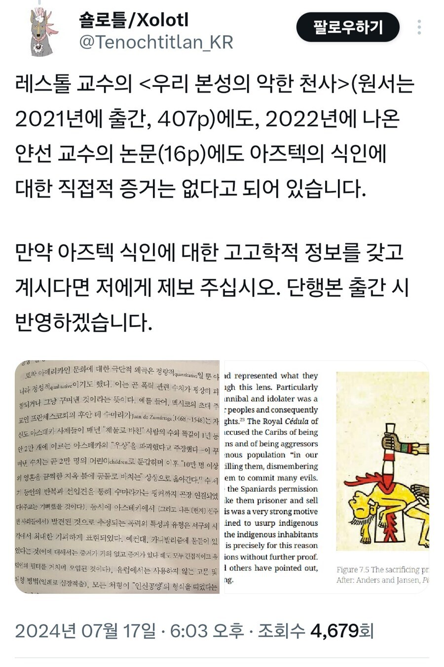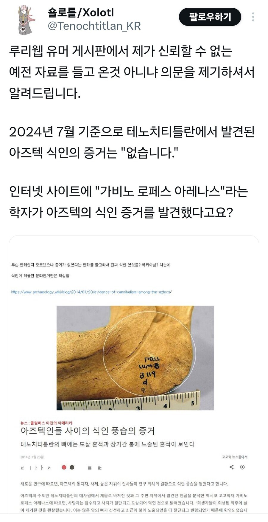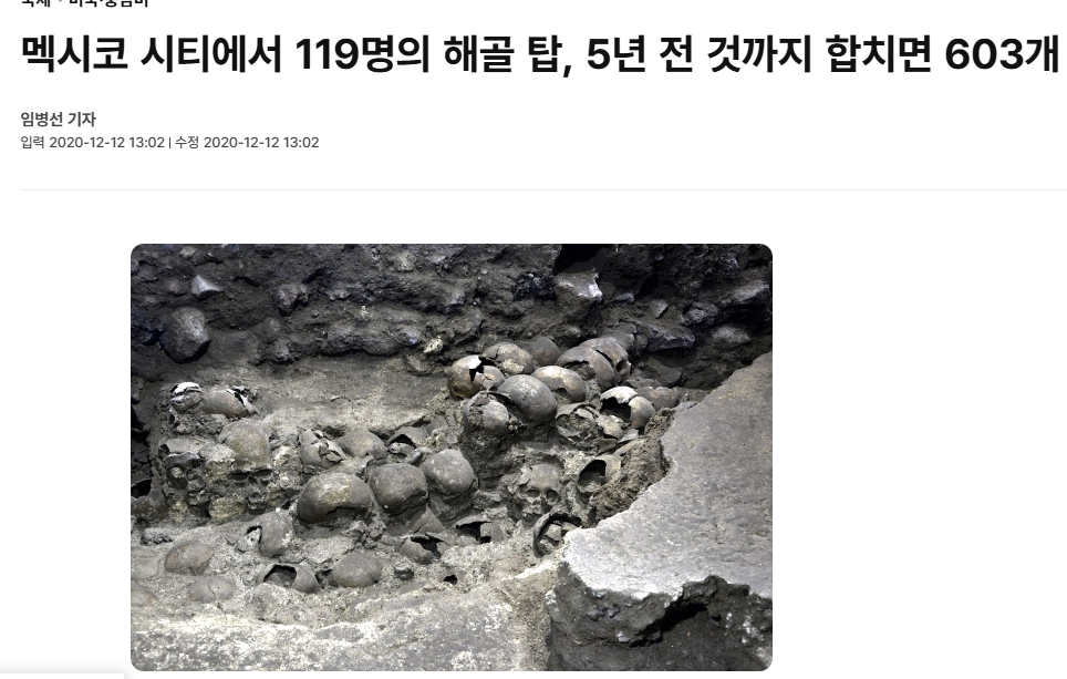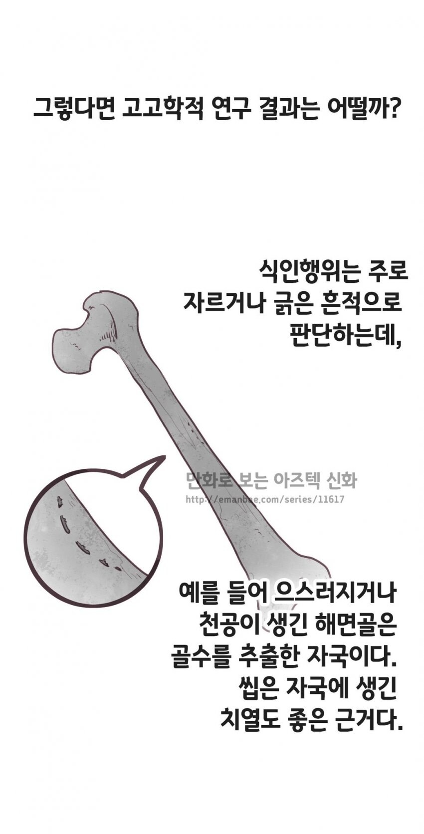 https://bbs.ruliweb.com/community/board/300143/read/72941498 "규모가 이거인데다가(약 600구 가량) 가짜유골까지 섞인데다가 식인 흔적은 또 안나와서 용도불명임 석회로 보존되어서 보존된 잘된 편 참고로 인신공양≠식인이라서 인신공양이 부정되는건 아님 다만 촘판틀리나 기타 고고학적 발굴로 인신공양의 규모도 상당히 미심쩍은 부분들이 많음(축제마다 10만 단위라는 과장된 수치) 특히나 스페인이 올때면 아즈텍은 국력 약화 및 통치의 실패도 있거니와 역으로 꽃의 전쟁에서 연달아서 패전중이었으니까 BODA에서 사학자들 나올때도 아즈텍 얘기 나오니 국내 학자들은 죄다 서구권의 심각한 왜곡이 무조건 들어갔다고 보는등 사실 학자들은 스페인측 기록을 거의 거르고 봄" 반박글도 이거고 여기에서도 집요할 정도로 식인과 도축에 관련된 흔적이 없다고 지적하는데 이건 본문에서조차 반박 못하는데 왜곡 아니냐?... | 26.03.01 22:34 | | |