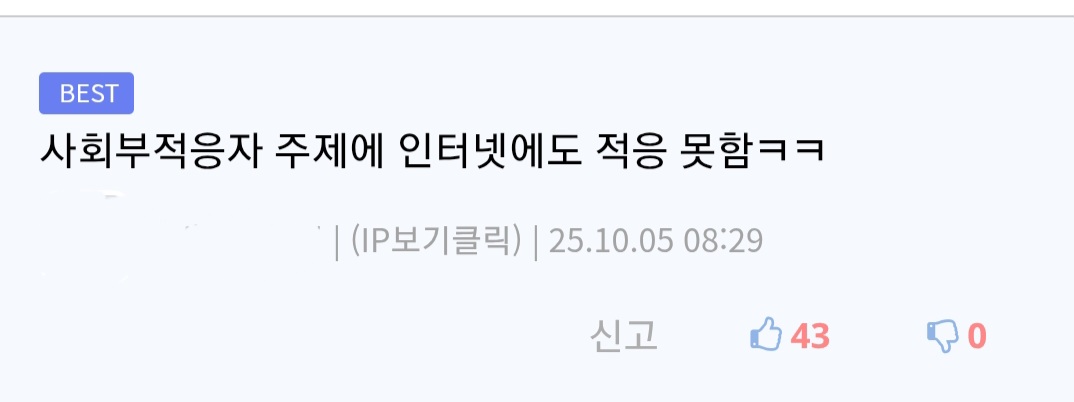 네 다음 인터넷 커뮤 규칙도 못 지키는 찐따 | 26.03.06 08:19 | | |