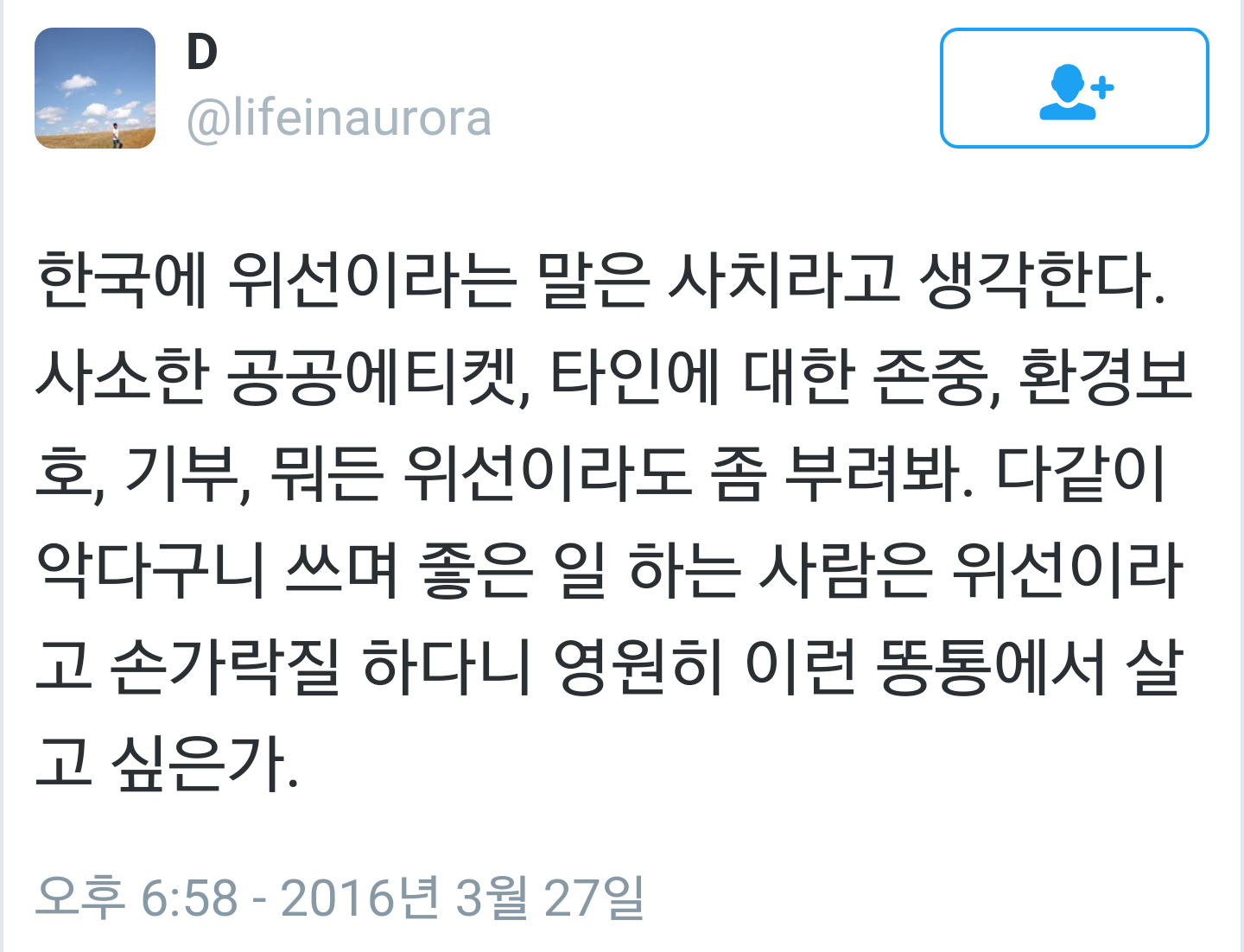 사람도 세상도 쓰레기라 부르짖으며 선행은커녕 예의범절조차도 곧이 곧대로 보지 못하고 무언가 이득이 있으니 저럴 것이다, 뭔가 꿍꿍이가 있음이 틀림없다 의심하여 결국 위선이라는 판단을 내리고 손가락질하고 욕함. 감사합니다 라는 말조차 위선이라고 까내리기 급급함. 근데 그렇게 생각하는 사람들이야말로 인삿말 하나조차도 뭔가 꿍꿍이를 갖고 한다는 거니까 그들이야말로 악인이 아닌지? | 26.03.07 22:04 | | |