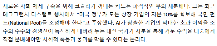 중요한것 : AI덕에 일할필요 없다 <<<<<<<<<<<<<<<< AI 더 발전하기전에 빨리 기업목졸라서 부를 재분배해야한다.