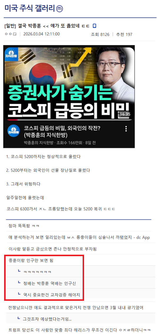 박종훈은 작년재작년까지 놓치지 않고 봤는데 어느순간 뷰가 나랑 좀 안맞더라 사실 코스피가 5200정도에서 한번 쉬어야 하는게 맞는데 쉬지않고 6300간건 외국인 선물보단 개인의 미친 매수세였음. 외국인은 7조 팔고 9조 팔고 하면서 어케든 누르려고 했음 | 26.03.09 16:36 | | |