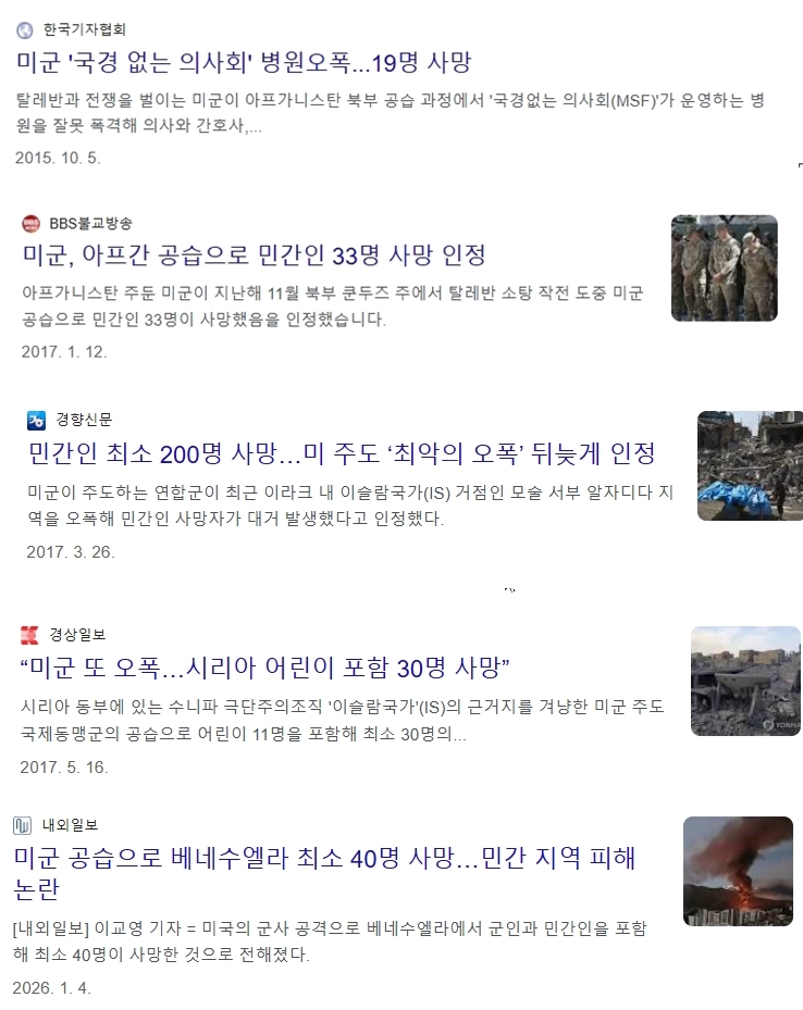 미군의 유명한 오폭사건은 이미 인터넷에 올라와 있다. <2002년 울루즈간(Uruzgan) 결혼식 오폭> 은 바로 검색이 되는 케이스라 유명하고 체크안된 여러건의 오폭이 있을거라는 증언이 다수 있음. 그래서 미군이 타겟 확인 절차를 고쳤다고 했던가 그렇게 기억이 나네. | 26.03.10 00:19 | | |