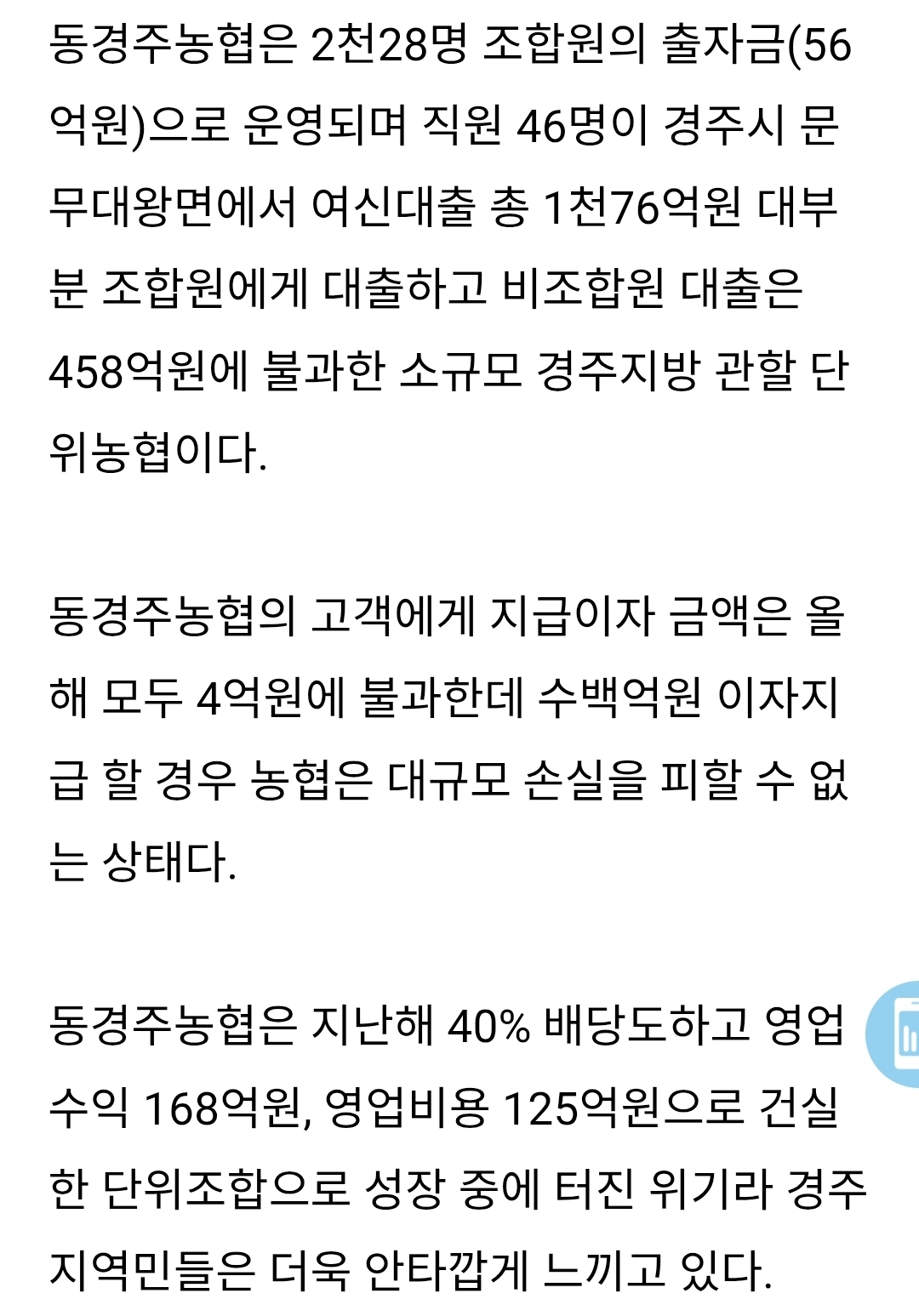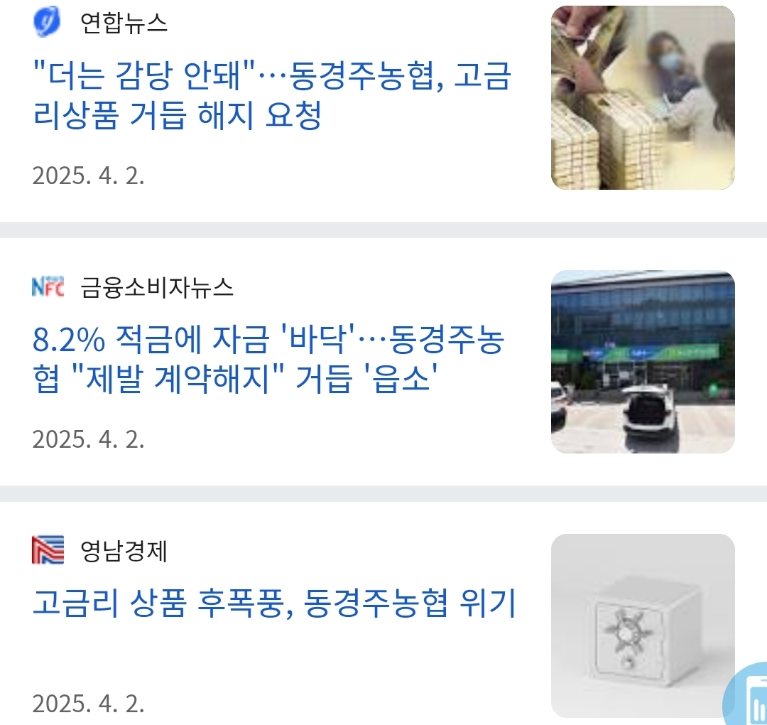자산 1670억원의 소규모 농협인 동경주농협의 1년 이자 비용만 수백억원에 달해 경영난이 발생할 수밖에 없는 상황이기 때문이다. 이에 2022년 12월부터 가입자를 대상으로 해지를 호소했지만 현재까지 계약금을 기준으로 약 2330억원이 남아있는 상황이다. 매년 5억~6억원의 흑자를 내는 동경주농협이 감당할 수 없는 수준에 이르렀다. https://www.newsfc.co.kr/news/articleView.html?idxno=70378 농협 측은 “컨설팅을 통해 예측한 결과 향후 3년간 적자 규모는 144억원을 상회하고 2025년 말 기준으로 부실농협으로 지정될 가능성이 높다”고 우려를 표명했다. 특히 “올해 11월 26일 36개월 초과 계좌에 대해서는 정상이자 지급이 불가능할 수도 있는 상황”이라며, “피해를 최소화하기 위해 비대면적금 상품 해지를 호소할 수밖에 없다”고 강조했다 https://www.ynenews.kr/news/articleView.html?idxno=62449 "얘들 실수했네! 돈이 된다!" 한테 털림 올해 상황까진 모르겠네 | 26.03.10 09:02 | | |