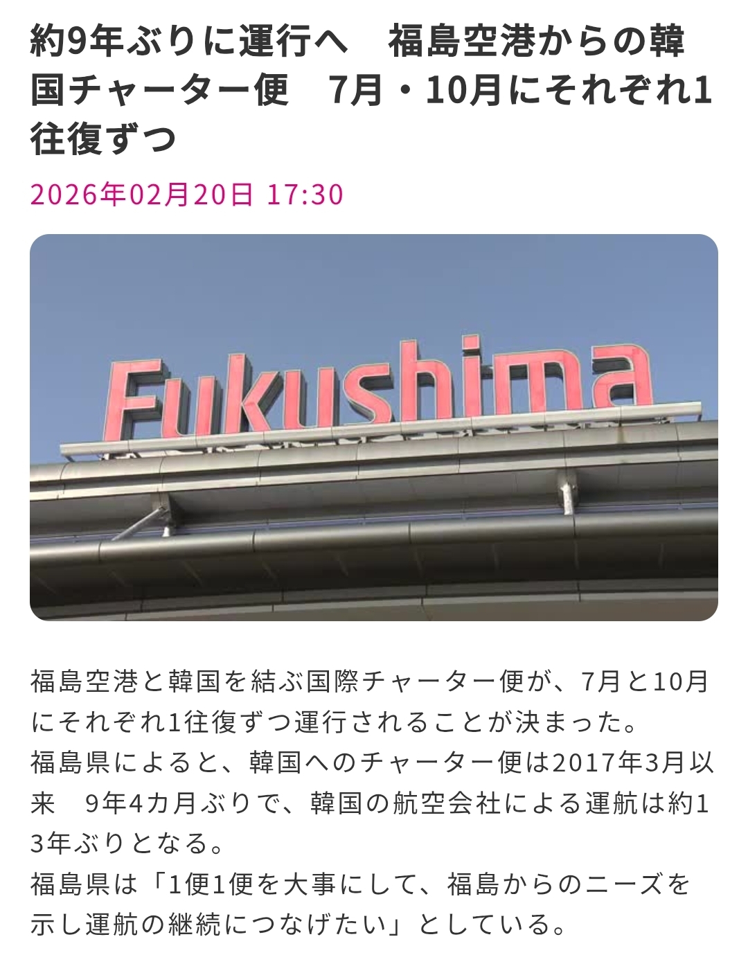 비정기편이긴 하지만 약 9년만에 후쿠시마 공항 한일노선이 부활한다네
