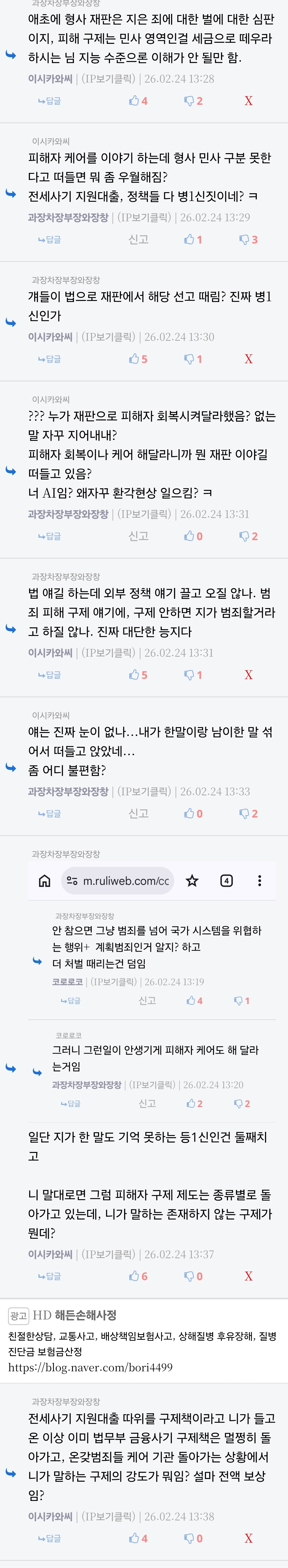 아니 형사 재판 이야기하면 정떡 됨? ㅋㅋㅋ 이게 정떡이면 애초에 한국 재판 어쩌고 이야기한 너도 정떡이지 빡통아 | 26.03.10 14:01 | | |