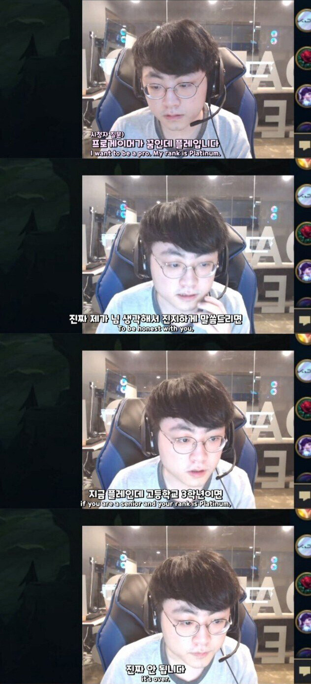 중1 플레티넘이면 프로는 무리지. 최소 그마는 찍어야 발 담궈볼 수 있는 수준이고 1군 들어가는 애들은 그 나이에 챌린저 찍는데