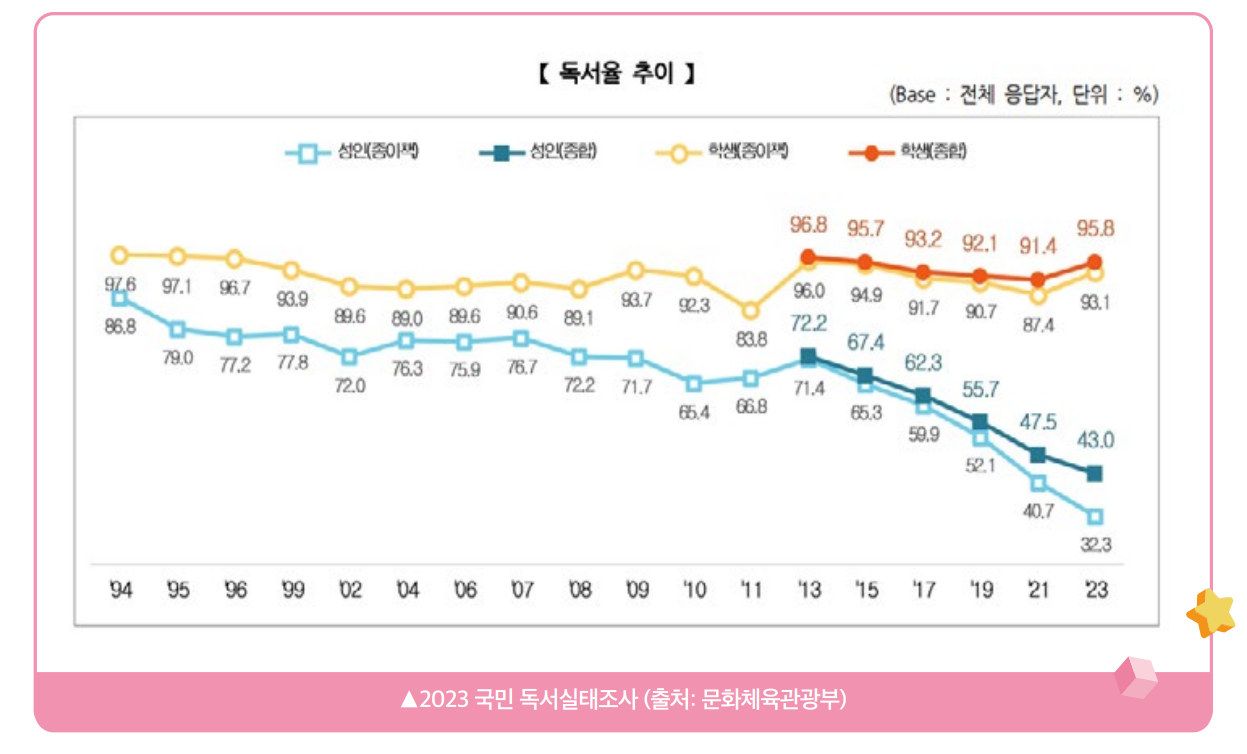 그 성인들이 학생때는 많이 읽게 했으니까 비교하려면 현재 성인인 사람들이 학생때 얼미나 읽게 했는지를 기져와야지 직장 생활에 돈 번다고 안 읽는 사람들 수치를 가져와 적다고 비교하면 어떻게함 | 26.03.10 18:47 | | |