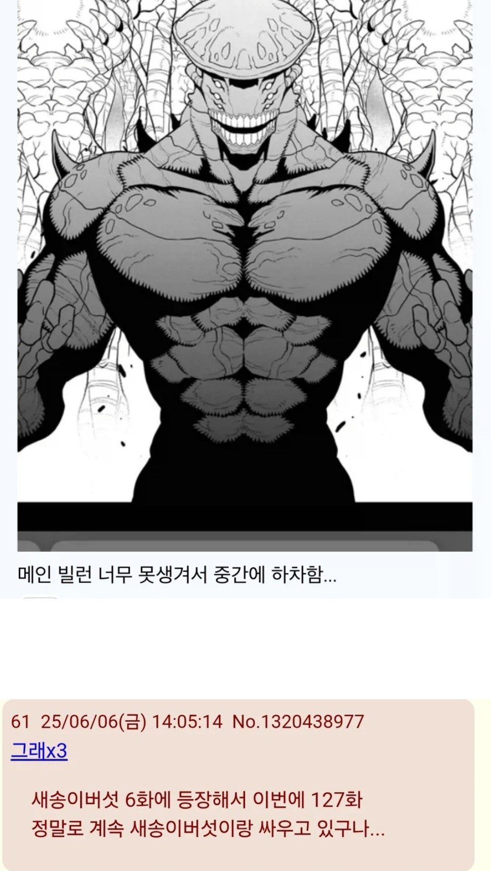 진짜 애매하긴했음. 압도적으로 강한 먼치킨도 초반한정이고 그렇다고 주인공이 성장하는 성장물도아니고 조연 성장만 존나보여줌 | 26.03.14 13:18 | | |