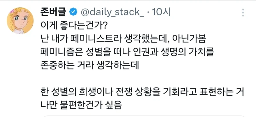 보통 정상적인 여성인권 향상 목적이면 이렇게 답하는게 맞긴함 온갖 분탕들이 그냥 남자죽어 해버리니까 그렇지 | 26.03.15 23:45 | | |