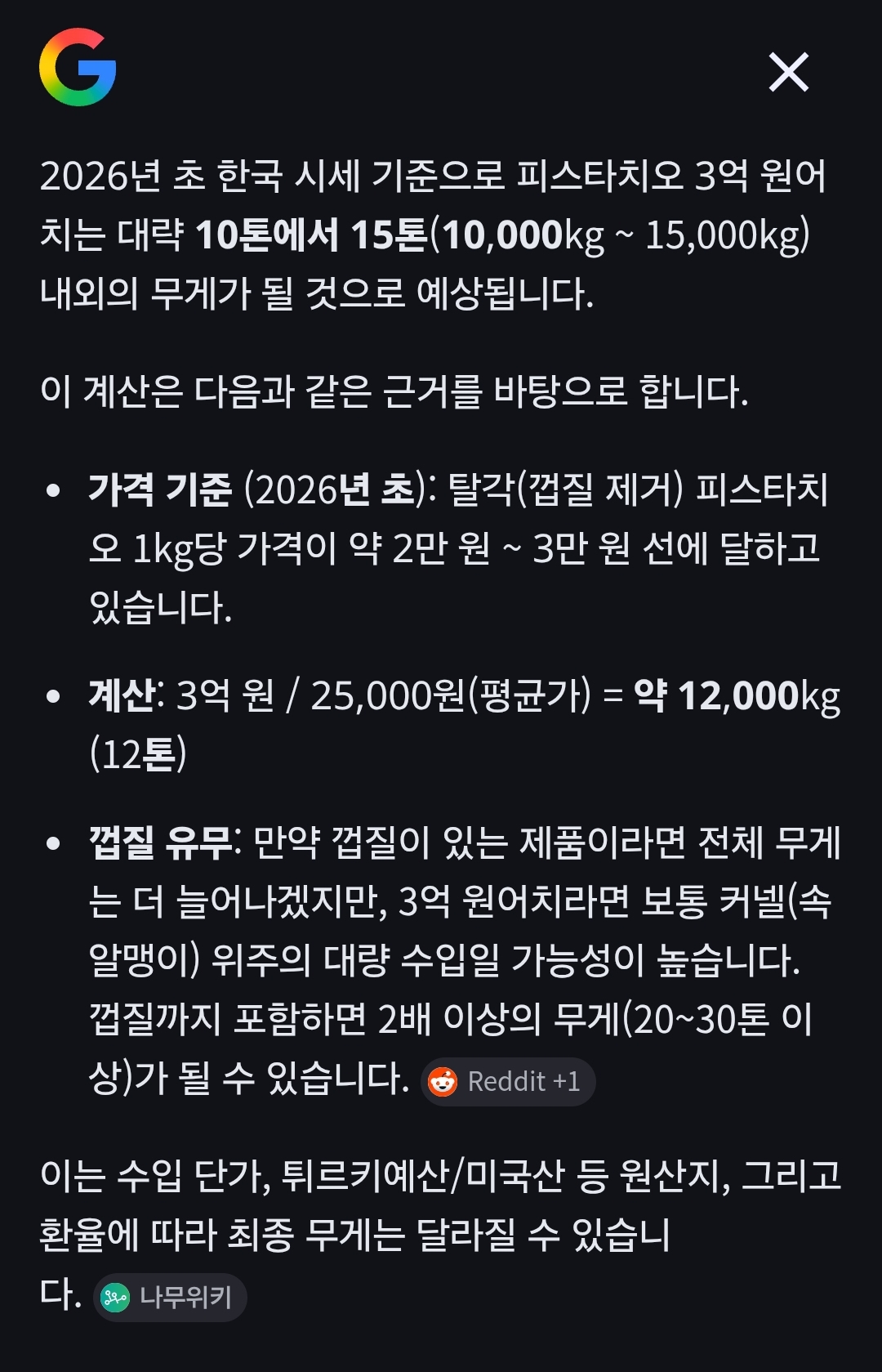 두쫀쿠 열풍당시 피스타치오 가격이 6배 가까이 폭등한바 있었고, 이것 때문에 두쫀쿠를 만드는 여러 자영업자, 그걸 구매하는 소비는 물론이고 피스타치오를 이용하는 각종 다른 소비유형들도 피해를 입었다 근데 3억원 어치면 평상가 기준으로는 16톤이고 최고가 기준으론 3.5톤인데 이걸 개인이 매입해서 소비도 다 못하고 썩혀가고 있으면 저런 반응이 나오지 인마 | 26.03.16 02:27 | | |