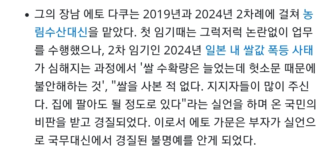 저 틀딱의 아들은 일본 쌀값폭등때 개소리 씨부려서 경질된거보면 그애비 그아들이네ㅋㅋㅋ