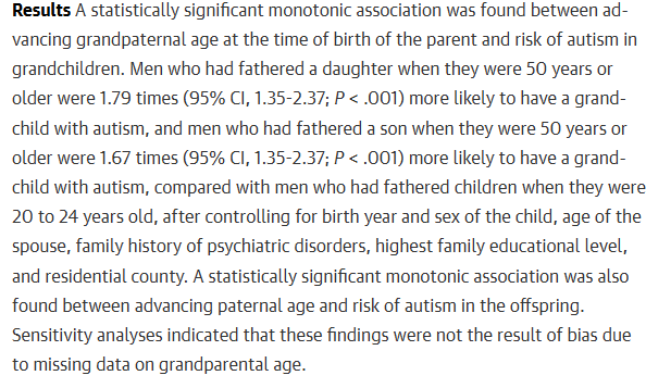 이미 20년전에 논문으로 나온것이 현재까지 현장에 딱히 알려지지 않았다는거 자체가 정설로 여겨지지 않았고 현상은 있으나 인과관계가 정립되지 않았기에 그런거 뿐인 내용인거임. 왜 정설로 받아들여지지 않았는가는 물론 여러 이유가 있겠지만 지금 따져볼 이유는 환경적 요인체크는 했느냐 같은 딮한 내용보단 asd가 있는 자식이 있는 가정에서 부계"만" 따지냐는거임. 부계 나이가 많으면 일반적으로 모계 나이도 많을텐데 이 조건은 어떻게 한것이며 그렇게 문제가 있다 할때 부모의 asd판정이 되어있는지와 유전형질이 어떤지 따져볼게 많은데 단순 조사 대상을 미리 정하고 현상을 끼워맞춘 내용으로 밖에 안보인다는거임. 그래서 정설로 안받아져서 현장에 안내려온거라고 밖에 생각 안드는 내용임 | 26.03.20 19:03 | | |