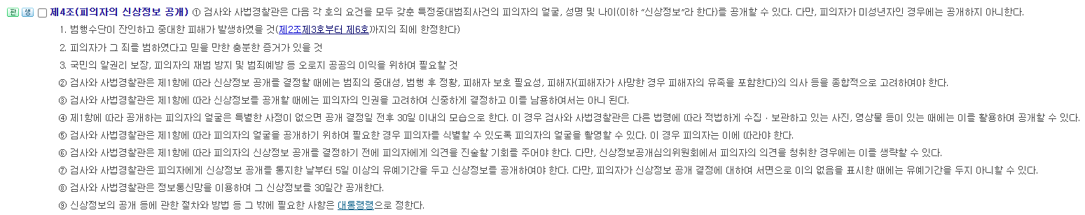 https://www.law.go.kr/LSW//lsInfoP.do?lsId=001133&ancYnChk=0#0000 신상공개의 원칙 삭제됬는데? 원래 이거 기준으로 신상위원해 개최하는데 이거 어디갔어 뭐지 이거? | 26.03.20 10:21 | | |