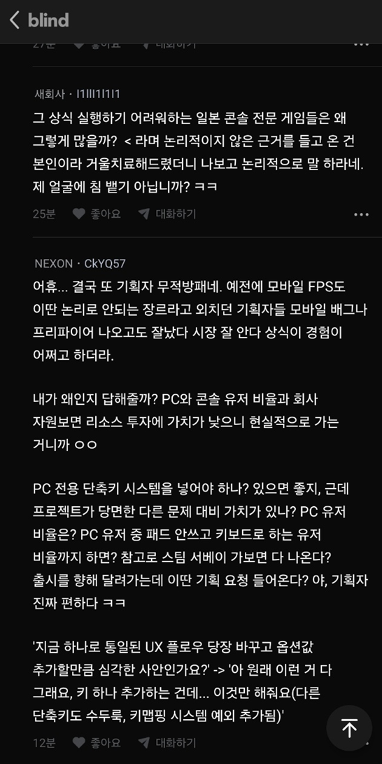 시발ㅋㅋㅋㅋ진짜 저딴 ㅂㅅ새끼가 게임회사에 있다고?뭔 플로우 바꾸니 뭐니ㅋㅋㅋ그렇게 따지면 여태 콘솔과 PC 동발로 나온 AAA급 게임들의 UX는 뭔데?걔네들은 뭐 투자가치가 있어서 그러나?ㅋㅋㅋㅋ저런 게 기획자니 피디니 설치니깐 카제나 따위가 게임이랍시고 설쳐대는거지 | 26.03.24 00:48 | | |