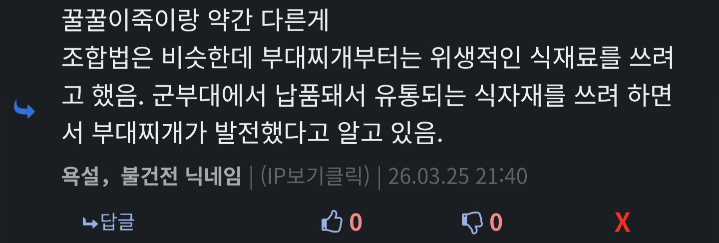 그건 꿀꿀이 죽이잖아 부대찌개랑 다름 | 26.03.25 21:18 | | |