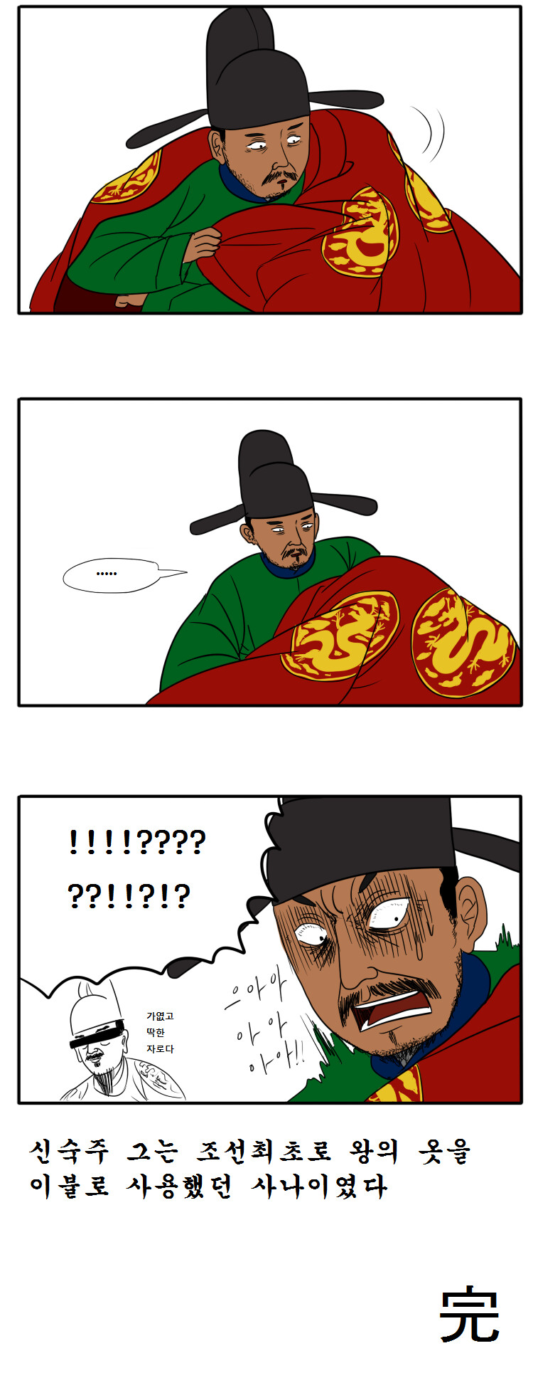 실록도 아니고 사관이 기록한 것도 아니지만, 1차 출처는 후대 야사가 아니라 당대 관료이자 신숙주와 친분이 두터웠던 서거정이 쓴 필원잡기란 수기에 수록된 일화라 실제 일어난 일일 가능성은 높음. 다만 실제론 기록된건 곤룡포가 아니라 어의임. 왕은 곤룡포 이외에도 평범한 옷도 많이 가지고 있고 그걸 다 어의라고 부르는데 그중 하나를 덮어준거 | 26.03.27 14:59 | | |