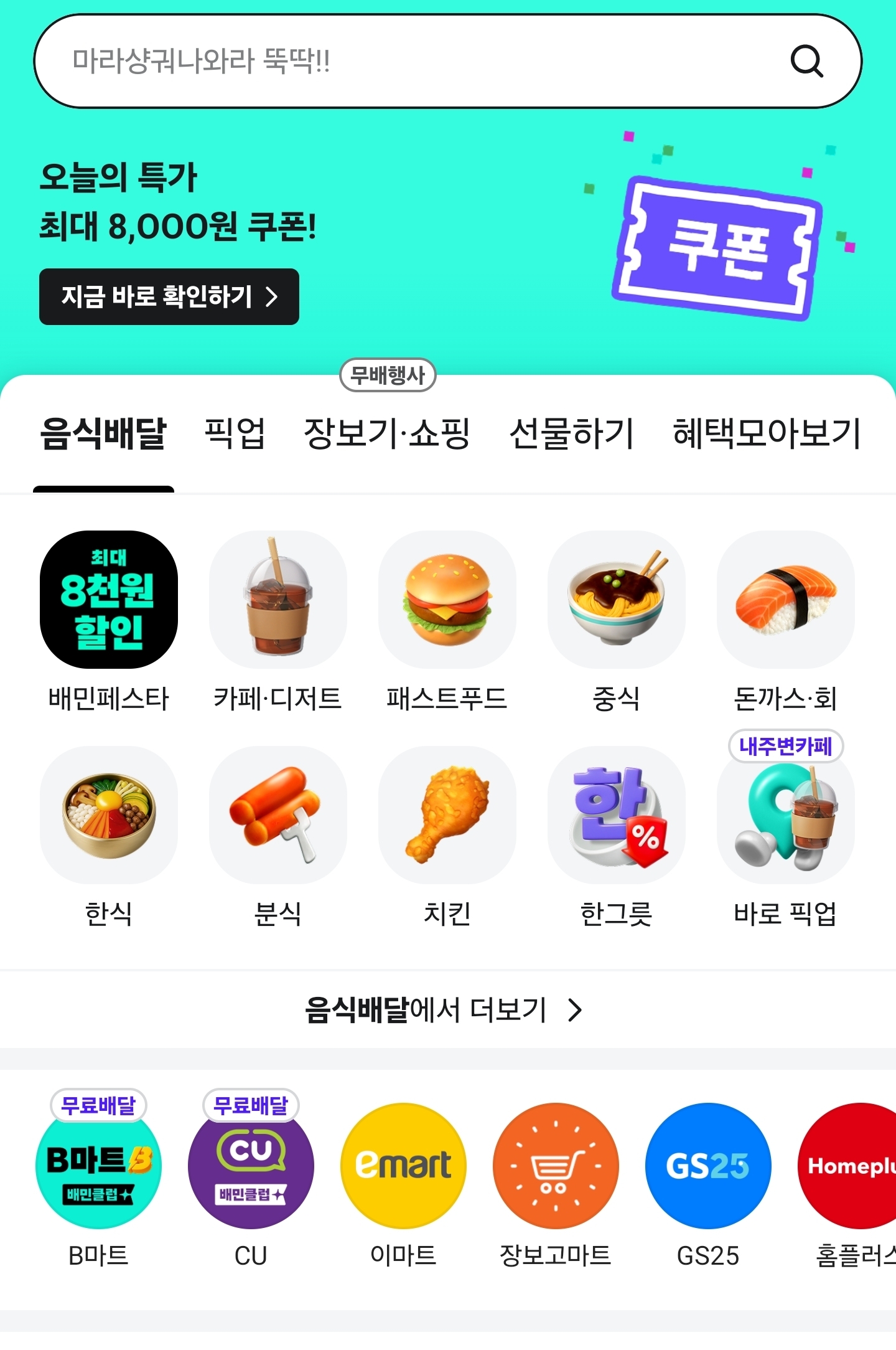 배민에 배달음식만 있는게 아닐껀데ㅋㅋ 배민만 왜 배달음식으로 리미트 걸린건데ㅋㅋ