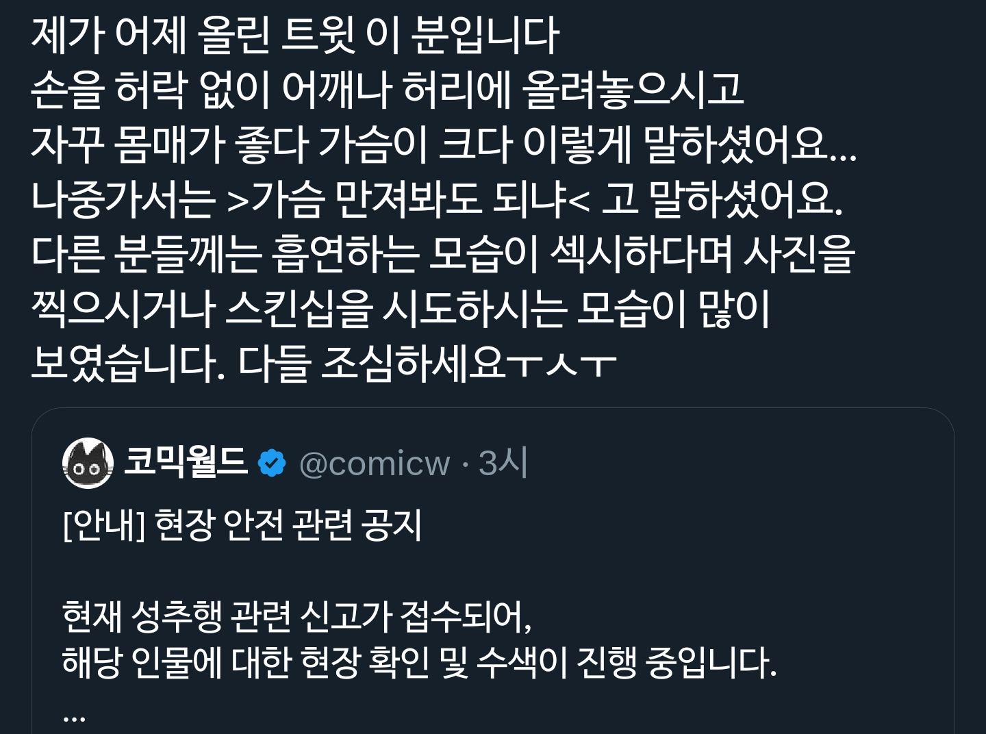 당일에 코믹월드 공식계정이 수배령 걸었는데 인용 트윗들 보니까 저놈한테 이런 식으로 당한 사람이 한둘이 아닌가보더라고