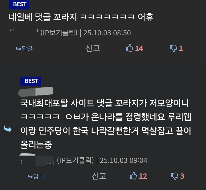 댓글도 안 달고 추천도 안 했는데 엥념사이트글 때문에 도매금으로 똑같이 취급당했던 걸 생각하면.... 어우~ㅋㅋㅋ | 25.10.03 14:13 | | |