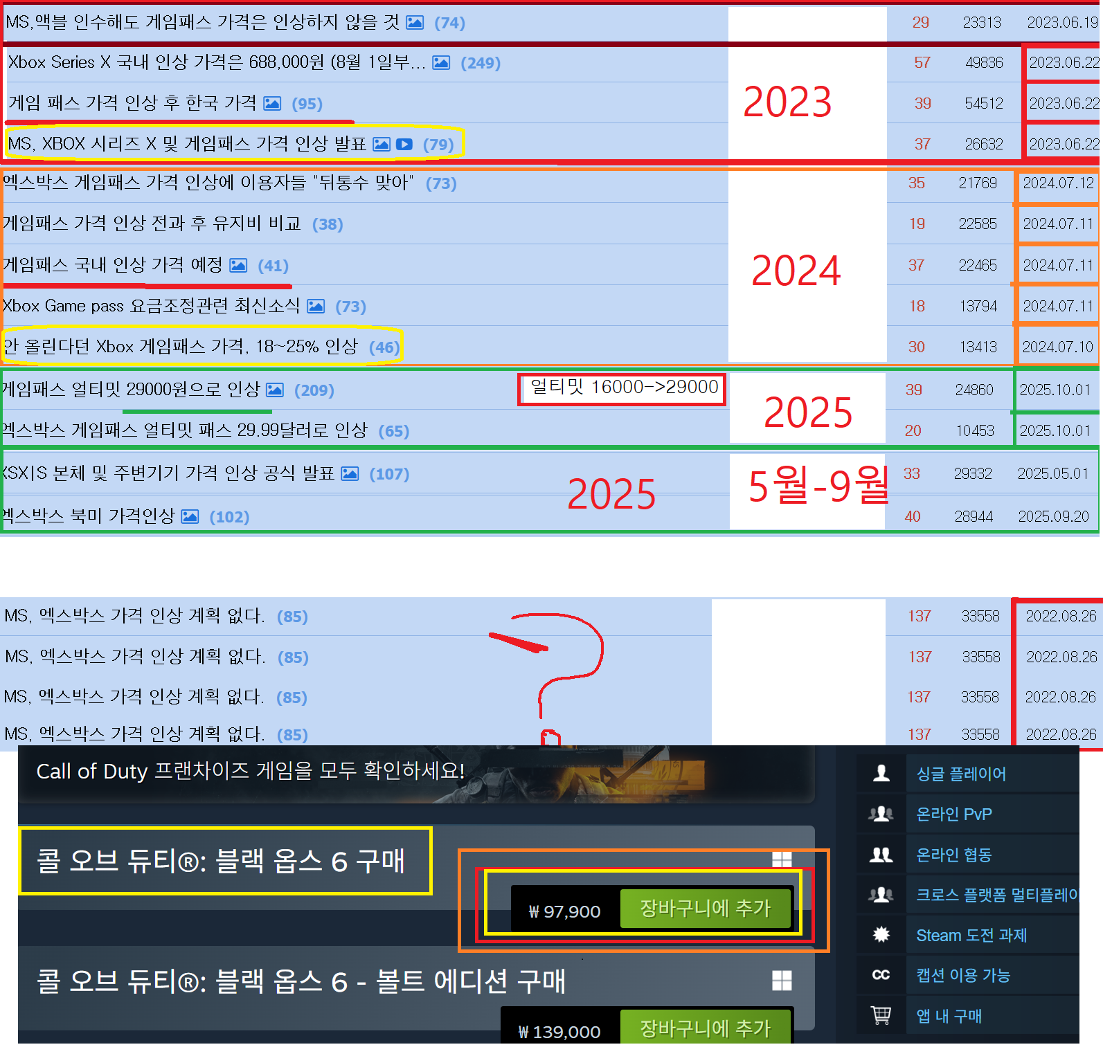 인수 결과 = 콜 오브 듀티 더빙 패싱 콜 오브 듀티 일반판 97,900원 3년 연속 기기값 인상 3년 연속 게임패스 인상 게임패스 얼티밋 29000원